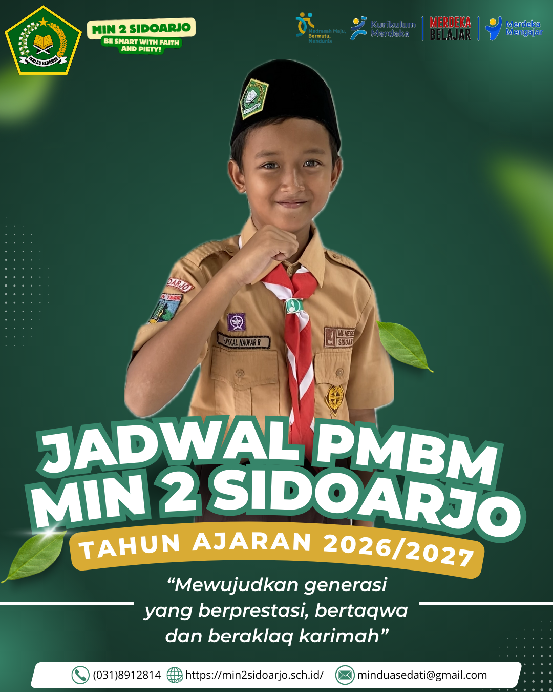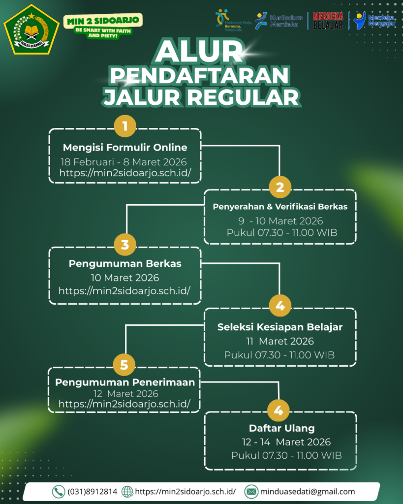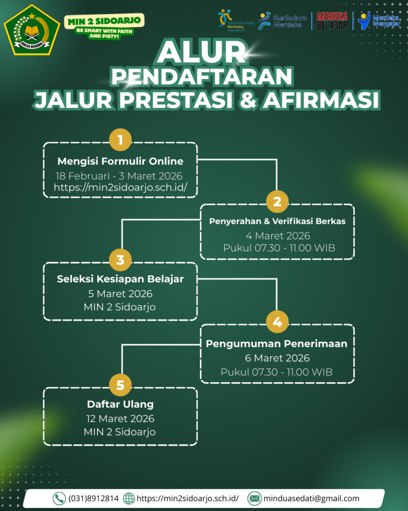 SIDOARJO – Madrasah Ibtidaiyah Negeri (MIN) 2 Sidoarjo resmi membuka Penerimaan Murid Baru Madrasah (PMBM) untuk Tahun Ajaran 2026/2027. Mengusung slogan “Be Smart, Fight, and Piety”, lembaga pendidikan ini siap menjaring calon peserta didik melalui berbagai jalur pendaftaran yang dimulai pada bulan Februari ini.